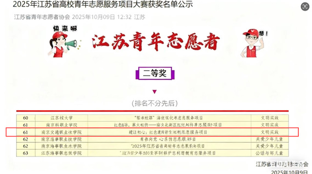 近日,2025年江蘇省高校青年志愿服務項目大賽在南京審計大學舉辦。學院“建證初心:紅色建筑保護與利用志愿服務項目”獲二等獎。