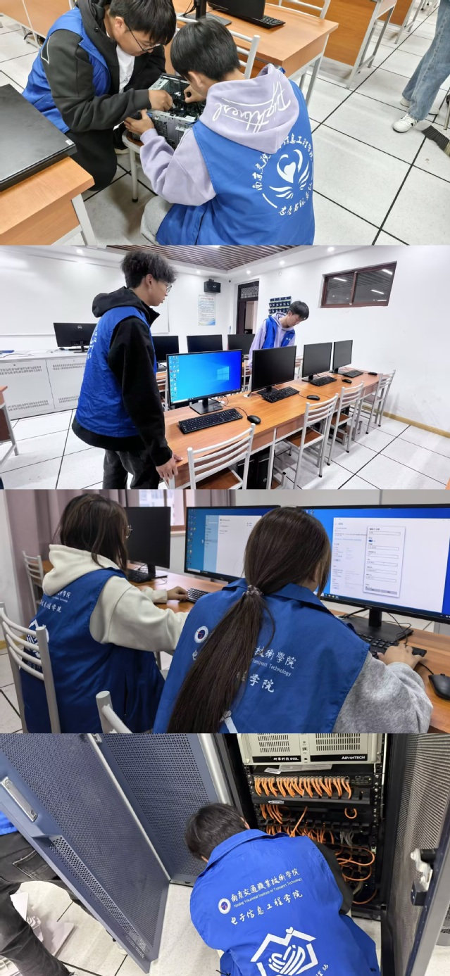 在計(jì)算機(jī)教研室李揚(yáng)老師和輔導(dǎo)員孫群越老師的指導(dǎo)下,學(xué)生們分組協(xié)作,有序開展各項(xiàng)工作。他們細(xì)致擦拭電腦屏幕、鍵盤和主機(jī),用專業(yè)工具清潔設(shè)備積塵;用專業(yè)知識(shí)對(duì)機(jī)房?jī)?nèi)錯(cuò)綜復(fù)雜的電源線和網(wǎng)絡(luò)線纜進(jìn)行重新規(guī)劃、捆扎整理,既改善了機(jī)房環(huán)境,也排除了安全隱患。同學(xué)們還參與了設(shè)備巡檢環(huán)節(jié),學(xué)習(xí)判斷設(shè)備運(yùn)行狀態(tài),確保機(jī)房設(shè)施正常運(yùn)行。