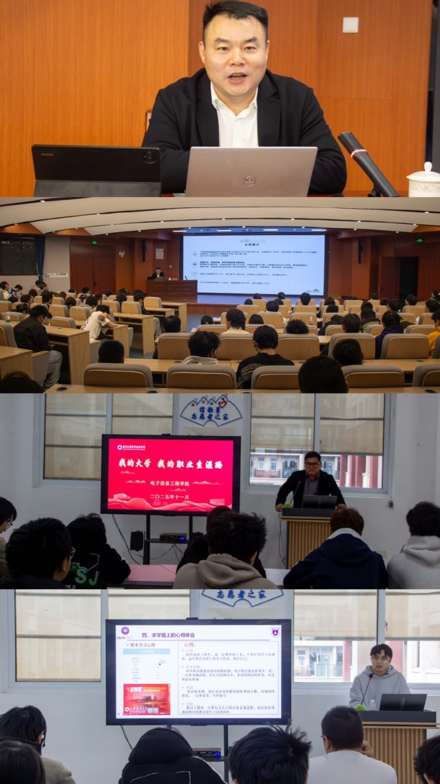 座談會(huì)后, 2002級校友劉新成、2007級校友薛松、2017級校友黃文健面向?qū)W院200余名學(xué)生開展了“我的大學(xué)·我的職業(yè)生涯路”校友訪談報(bào)告。他們分享了在校期間的學(xué)習(xí)經(jīng)驗(yàn)和創(chuàng)業(yè)歷程中的挑戰(zhàn)與突破。