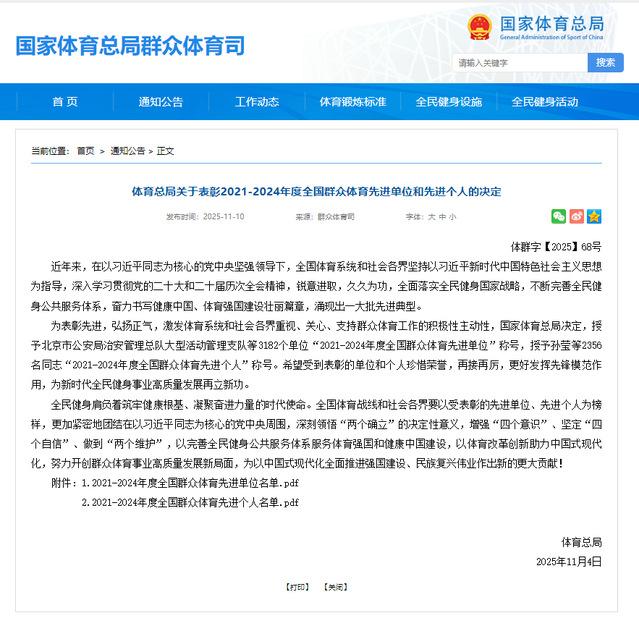 11月10日,國(guó)家體育總局、人力資源社會(huì)保障部共同對(duì)獲得2021-2024年度全國(guó)群眾體育先進(jìn)單位進(jìn)行表彰。我院憑借扎實(shí)深入的群眾體育工作與富有成效的服務(wù)實(shí)踐,成功入選表彰名單,充分體現(xiàn)了學(xué)院在推動(dòng)體育育人、服務(wù)全民健康方面的積極貢獻(xiàn)獲得高度認(rèn)可。