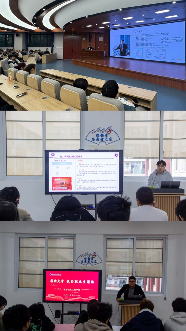 2025年11月8日,電子信息工程學(xué)院分別在明德樓報告廳、J棟一站式學(xué)生社區(qū)舉辦“我的大學(xué)我的職業(yè)生涯路”分享會。分享會邀請優(yōu)秀校友劉新成、黃文健、薛松主講,共計260余人參加本次活動。