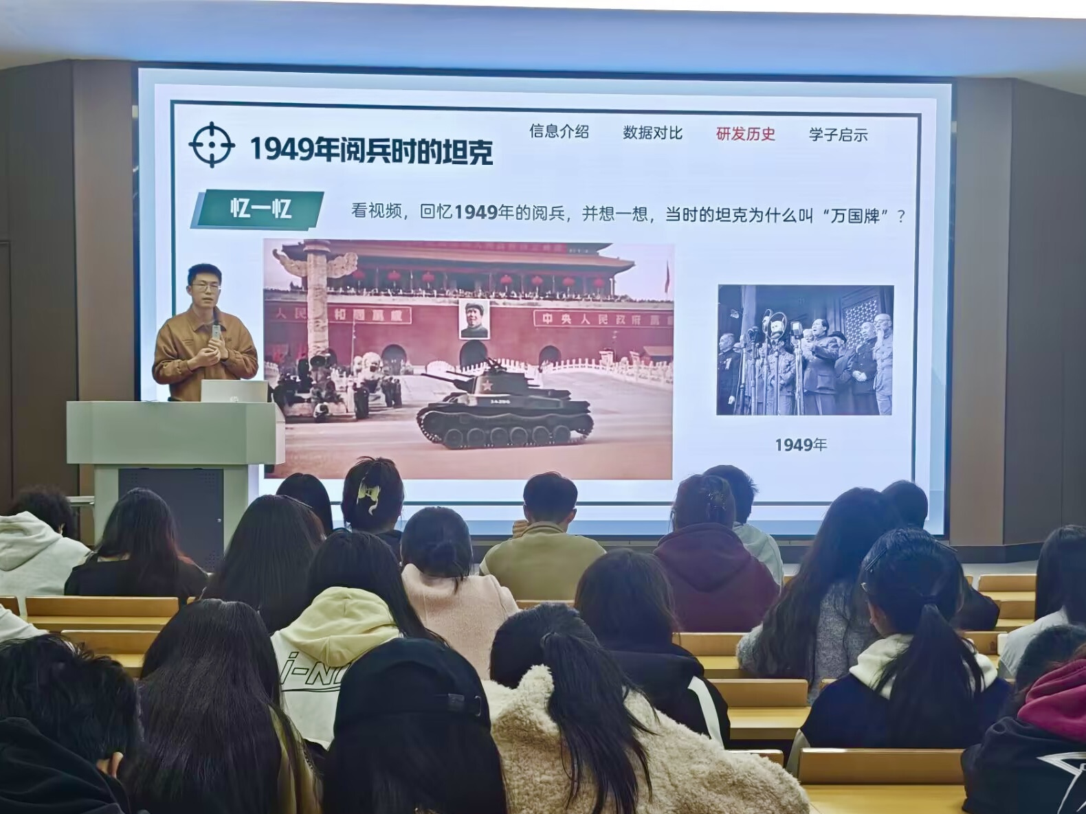 主講人楊濤老師首先介紹了99A式主戰(zhàn)坦克、GL - 6主動(dòng)防御系統(tǒng),闡述它們對(duì)我國國防現(xiàn)代化產(chǎn)生的深刻積極影響,有力證明了我國國防工業(yè)體系的完備性以及強(qiáng)大的創(chuàng)新能力,極大地激發(fā)了全體入團(tuán)積極分子的民族自豪感與愛國熱情。