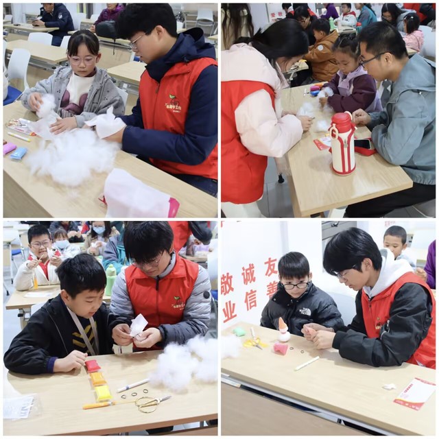 手工制作環(huán)節(jié)中,志愿者與孩子們攜手合作,利用洗臉巾、棉花、橡皮泥等材料,一步步制作出各具特色的小雪人。過程中,志愿者們耐心指導(dǎo)、細(xì)致協(xié)助,不僅鍛煉了溝通與實(shí)操能力,更在親切互動(dòng)中傳遞了關(guān)懷與鼓勵(lì)。活動(dòng)不僅提升了孩子們的創(chuàng)造力和動(dòng)手能力,也為志愿者提供了踐行公益、服務(wù)社會(huì)的實(shí)踐平臺(tái),體現(xiàn)出資助育人工作室“受助-自助-助人”的良性循環(huán)理念。