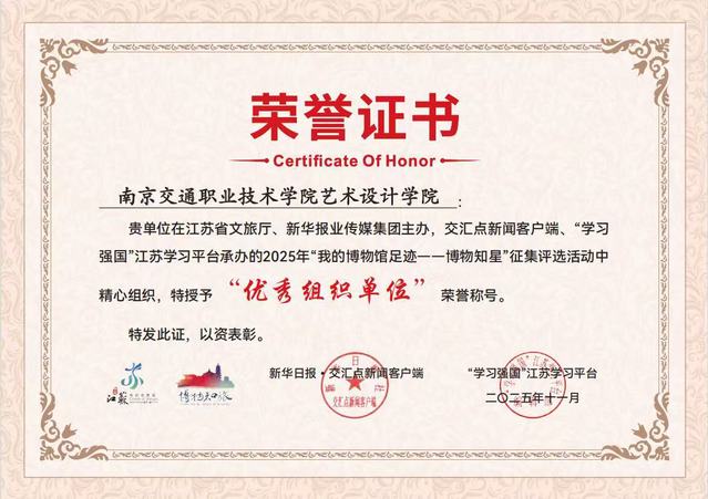 近日,在由江蘇省文化和旅游廳、新華報(bào)業(yè)傳媒集團(tuán)聯(lián)合主辦,交匯點(diǎn)新聞客戶端、“學(xué)習(xí)強(qiáng)國”江蘇學(xué)習(xí)平臺(tái)具體承辦的2025年“我的博物館足跡——博物知星”征集評選活動(dòng)中,藝術(shù)設(shè)計(jì)學(xué)院憑借精心組織與深度參與,被授予“優(yōu)秀組織單位”榮譽(yù)稱號(hào)。