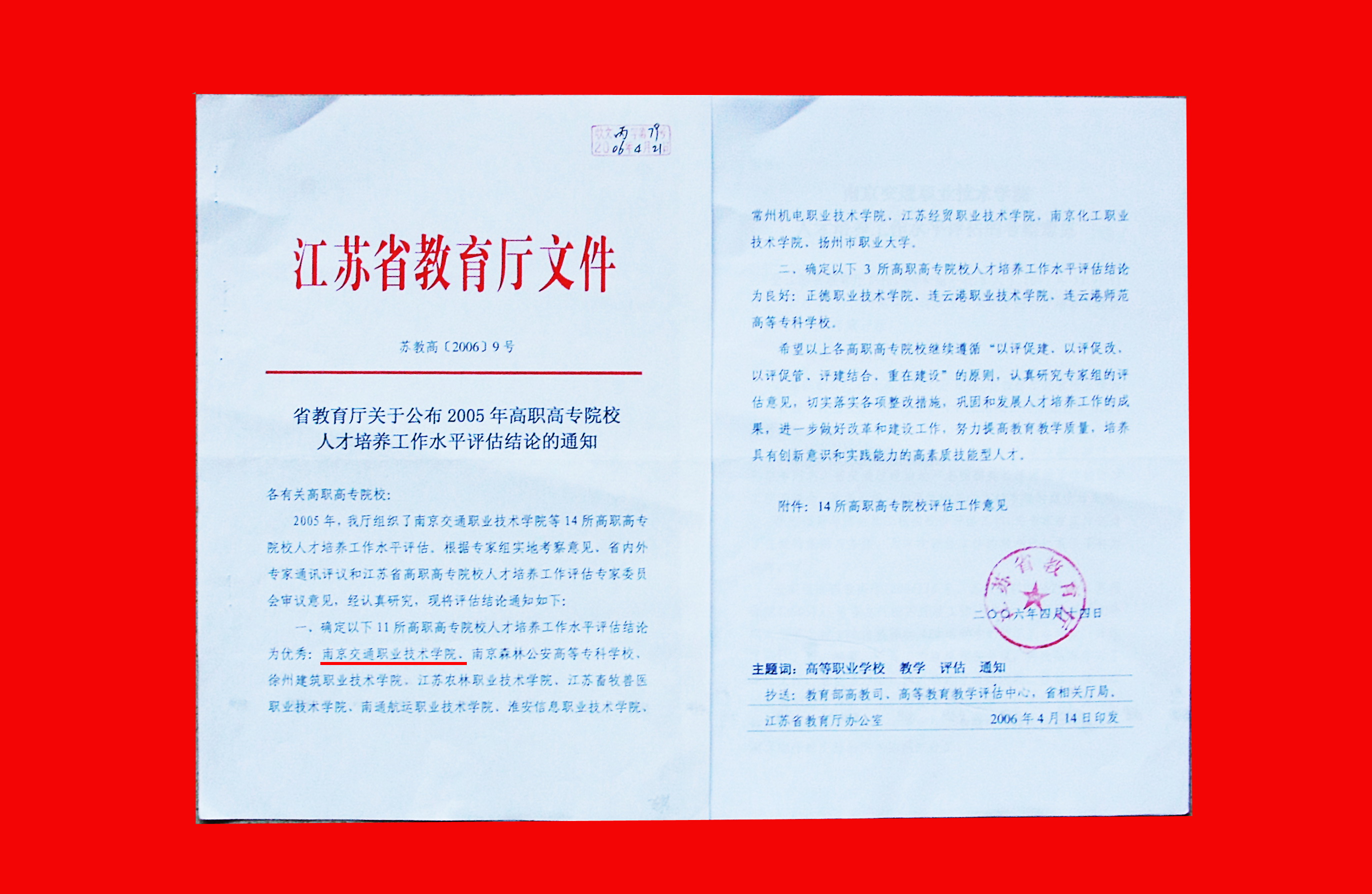 以?xún)?yōu)異成績(jī)、優(yōu)秀等次通過(guò)高職高專(zhuān)人才培養(yǎng)工作水平評(píng)估并被確定為省示范性高職院建設(shè)單位