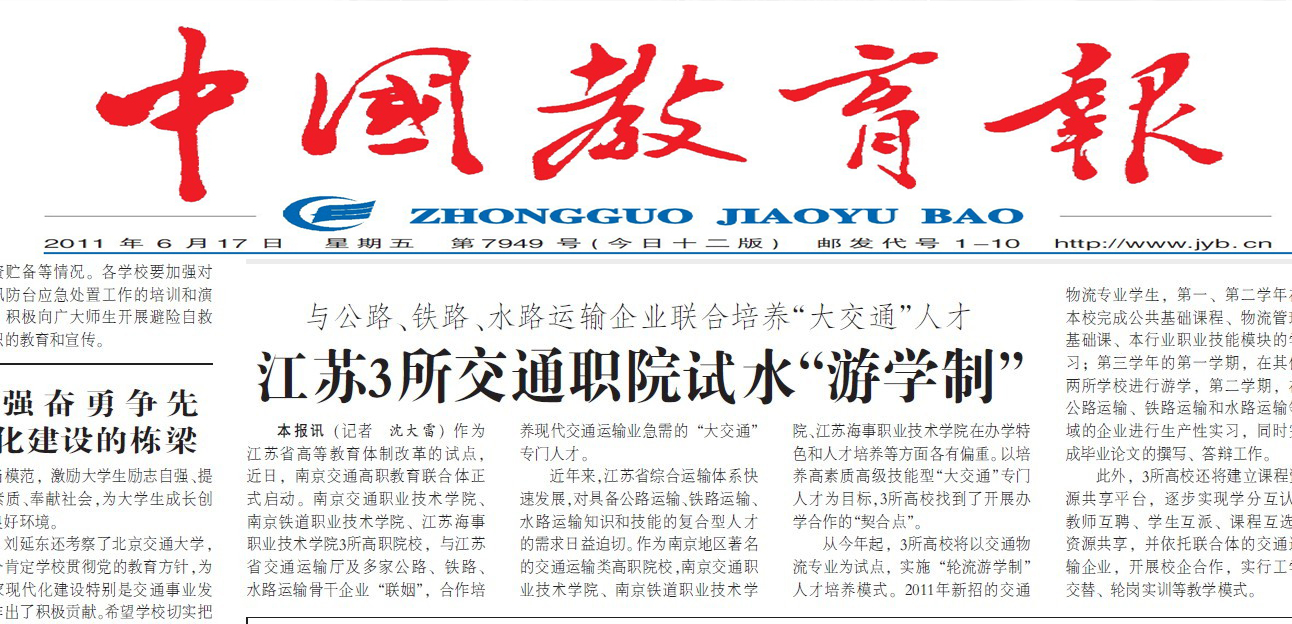 學院深化辦學體制機制改革,2011年6月,作為江蘇省高等教育體制改革的試點項目,“南京交通高職教育聯(lián)合體”正式啟動。聯(lián)合體由南京交通職業(yè)技術學院、南京鐵道職業(yè)技術學院、江蘇海事職業(yè)技術學院三所高職院校組成,自2011年起,以交通物流專業(yè)為試點,采用“2+0.5+0.5”的“游學制”,聯(lián)合培養(yǎng)適應“大交通”的復合型、技能型人才。