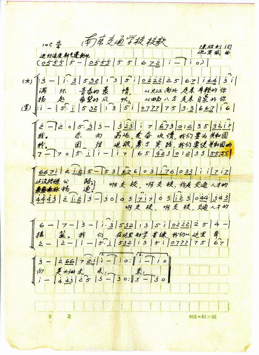 一星期后,我接到王書記通知,說沈老已經(jīng)完成校歌譜曲,并將親自到校教唱,舉辦講座。第二天下午,我受學(xué)校委派專程去請(qǐng)沈老。剛一見面,沈老將一張16K大小的淺綠色方格信箋遞過來。我定睛一看,正是沈老親筆書寫的《南京交通學(xué)校校歌》詞曲譜!沈老興致勃勃地從頭到尾唱了一遍,謙虛地表示擔(dān)心學(xué)校師生不滿意。來學(xué)校的路上,沈老關(guān)切地詢問起了南京交通學(xué)校的規(guī)模、生源、就業(yè)等情況。當(dāng)小車緩緩駛?cè)胄@,看到整潔的校園、體育場上生龍活虎的學(xué)生,沈老高興地說了一句:這是一所不錯(cuò)的學(xué)校呀!