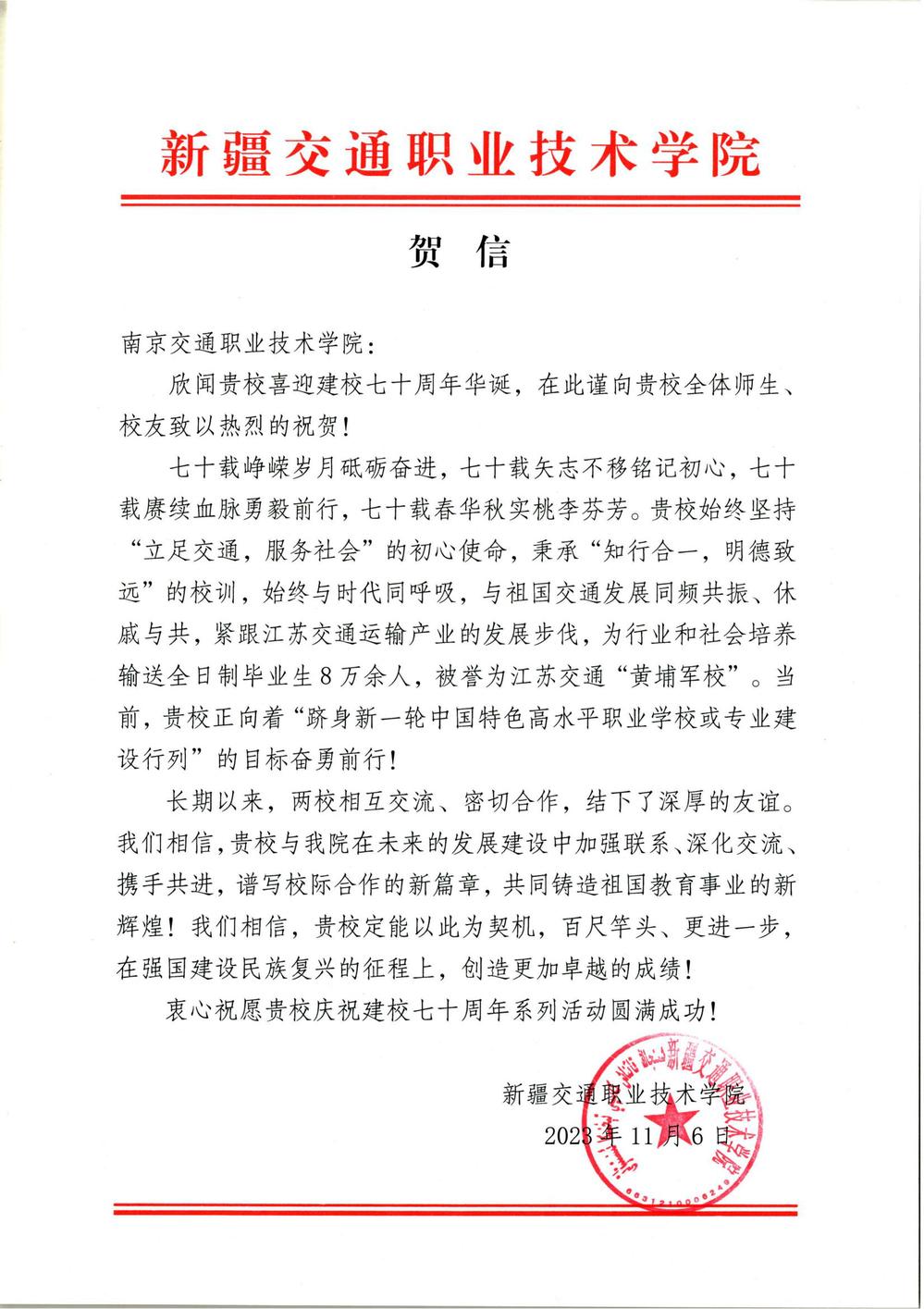 新疆交通職業(yè)技術學院賀信