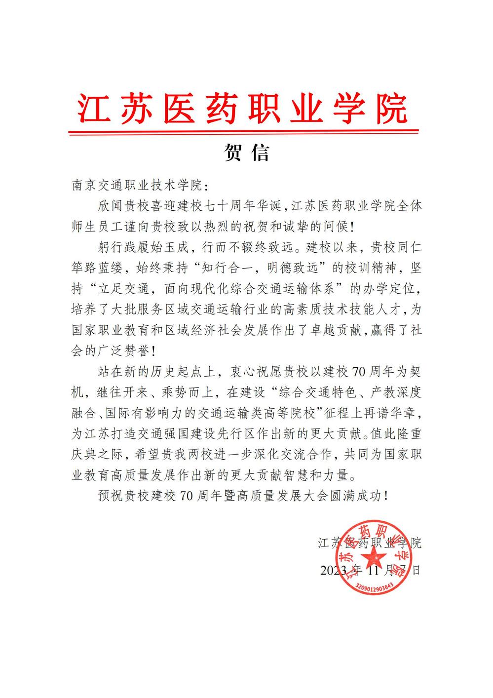 江蘇醫(yī)藥職業(yè)學(xué)院賀信