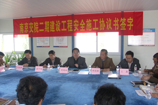 近期,為進一步加強校園二期工程“圖文信息樓、行政辦公樓、H和I學生公寓”的安全施工,學院分別與南京第一建筑工程集團有限公司、江蘇潤揚集團有限公司、南京永騰建筑工程有限公司三家工程承建單位簽訂了《安全施工協(xié)議書》。協(xié)議重點強調(diào)了校園交通安全,對施工車輛的行駛線路、施工人員的作業(yè)、活動區(qū)域等都作了嚴格規(guī)范。