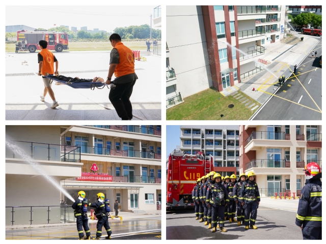 劉雪芬副院長宣布演練正式開始。伴隨著煙霧的彌漫與消防自動警報聲的響起,宿管人員立即撥打119報警電話同時向學(xué)院監(jiān)控中心報警,在得到消防人員的指令后,校衛(wèi)隊員和義務(wù)消防隊員立即按照預(yù)案趕赴現(xiàn)場開展救援和滅火,同時K組團師生立刻進入消防應(yīng)急疏散演練狀態(tài)。學(xué)生們打濕毛巾捂住口鼻、彎腰靠墻,在輔導(dǎo)員、宿舍管理人員的引導(dǎo)下,迅速有序地從最近出口撤離至室外安全地帶,在疏散中受傷的學(xué)生由救護人員使用擔(dān)架進行救護撤離。撤離后,值班輔導(dǎo)員清點人數(shù),確保沒有學(xué)生被困。隨后,高新園消防救援中隊為師生演示了消防車救援裝備和消防水帶的使用方法,并指導(dǎo)師生開展實際操作體驗。自此,演練圓滿完成。