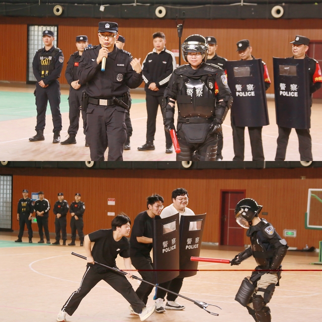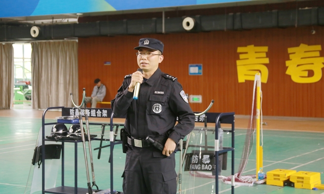 實操技能培訓環(huán)節(jié),王俊詳細講解示范了警棍、鋼叉、盾牌等器械的使用方法,指導盾牌攻防技術及鋼叉的配合使用等技能,介紹和演示了暴恐襲擊現(xiàn)場的控制、抓捕和解脫,演示了擒拿防身術,現(xiàn)場部分安保、宿管人員還積極參與了互動演練。