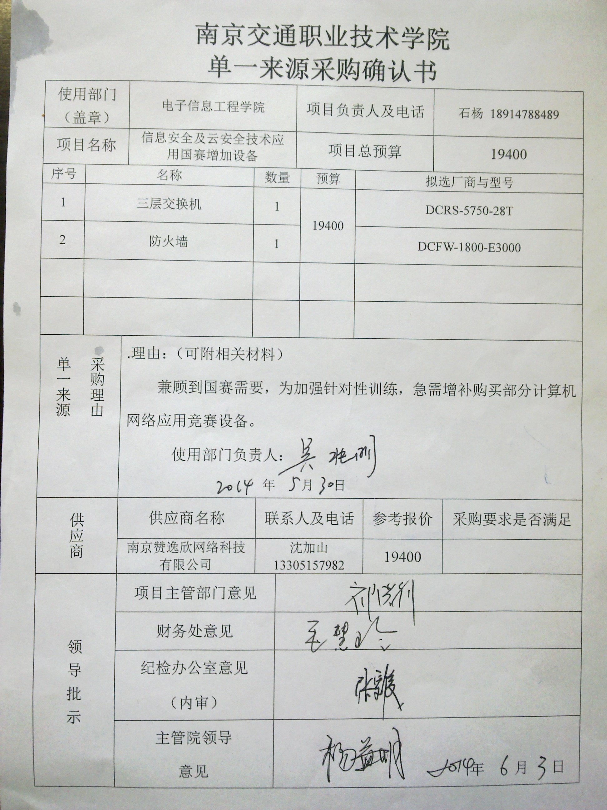 我部門受電子信息工程學(xué)院的委托,擬對(duì)該部門委托的采購(gòu)編號(hào)為JY2014041號(hào)2014年國(guó)賽項(xiàng)目實(shí)施院級(jí)集中采購(gòu)。本部門根據(jù)采購(gòu)人的實(shí)際申報(bào)情況,擬對(duì)該項(xiàng)目采用單一來(lái)源采購(gòu)方式。