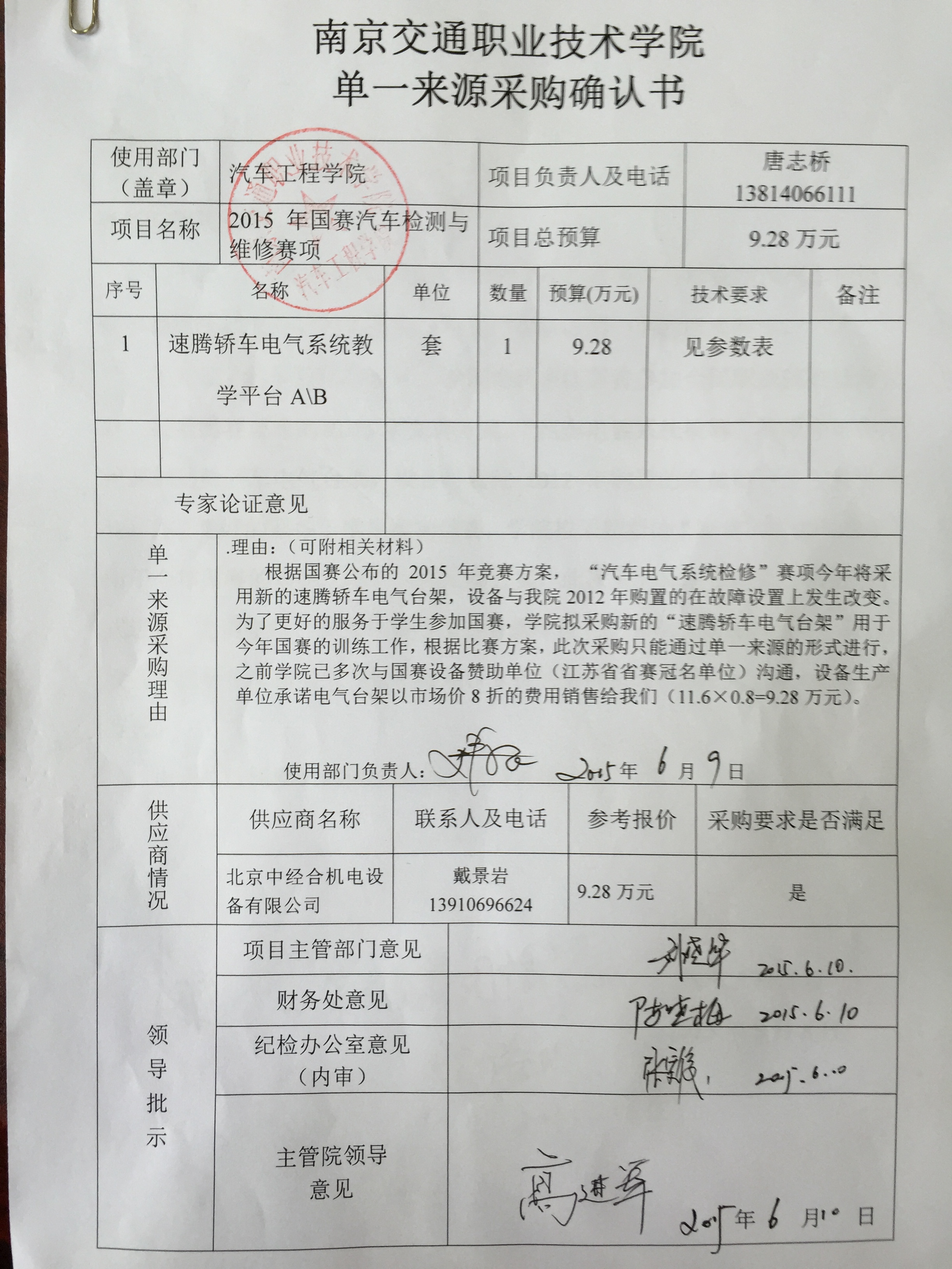 我部門受汽車工程學院的委托,擬對該部門委托的采購編號為JY2015070號2015國賽汽車檢測與維修設(shè)備采購項目實施院級采購。本部門根據(jù)采購人的實際申報情況,擬對該項目采用單一來源采購方式。