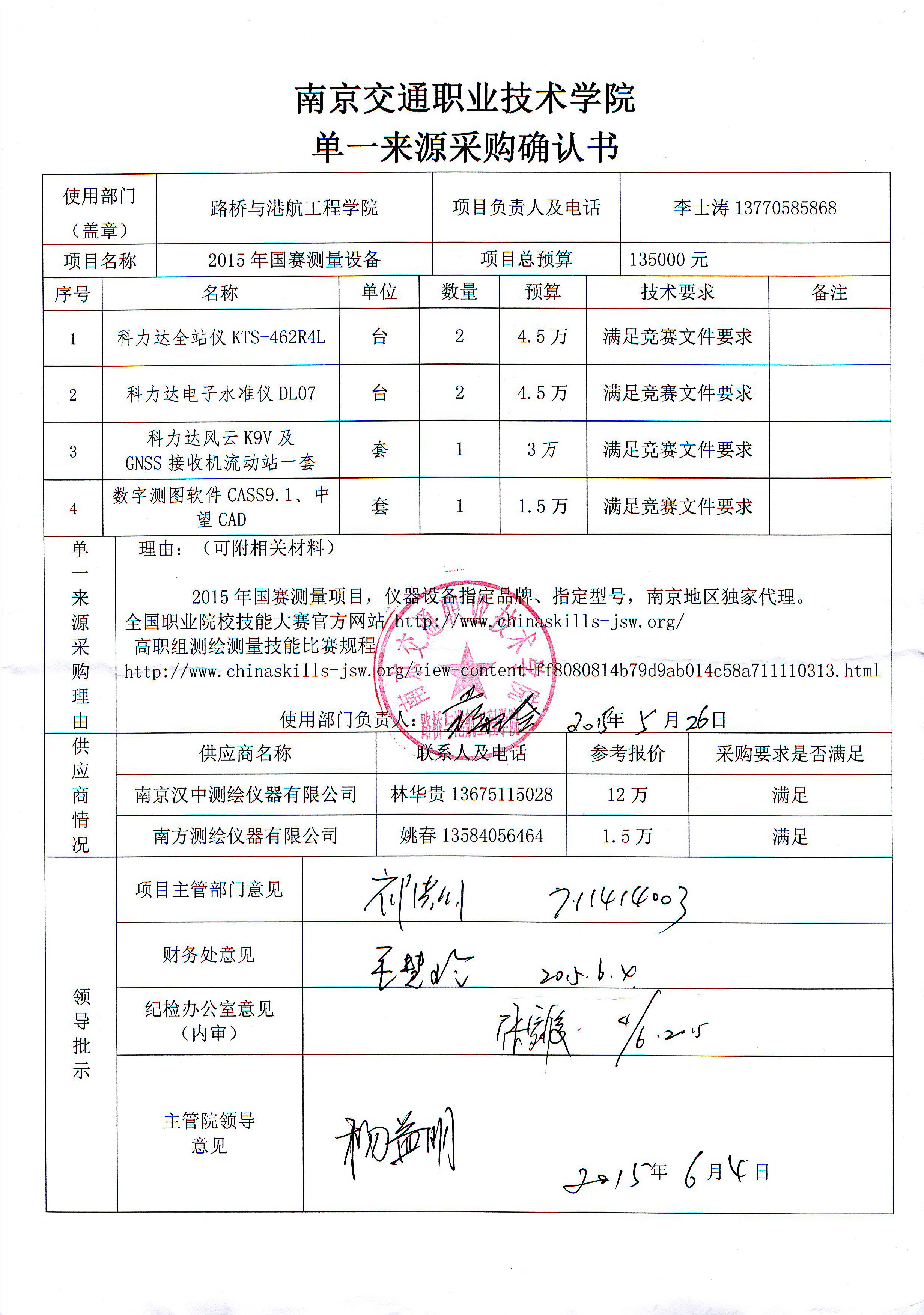我部門(mén)受路橋與港航工程學(xué)院的委托,擬對(duì)該部門(mén)委托的采購(gòu)編號(hào)為JY2015069號(hào)2015國(guó)賽測(cè)量設(shè)備采購(gòu)項(xiàng)目實(shí)施院級(jí)采購(gòu)。本部門(mén)根據(jù)采購(gòu)人的實(shí)際申報(bào)情況,擬對(duì)該項(xiàng)目采用單一來(lái)源采購(gòu)方式。