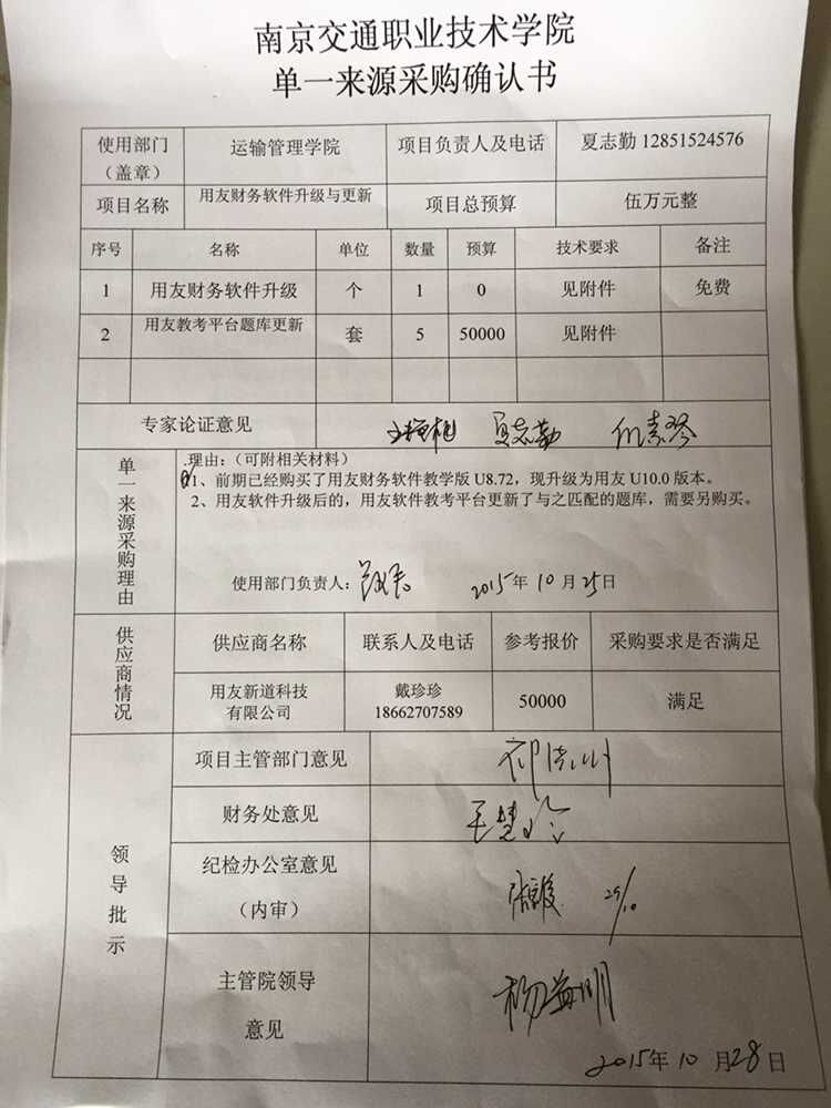 我部門受運(yùn)輸管理學(xué)院的委托,擬對該部門委托的采購編號為JY2015122號用友財務(wù)軟件升級與題庫更新項目實施單一來源采購。