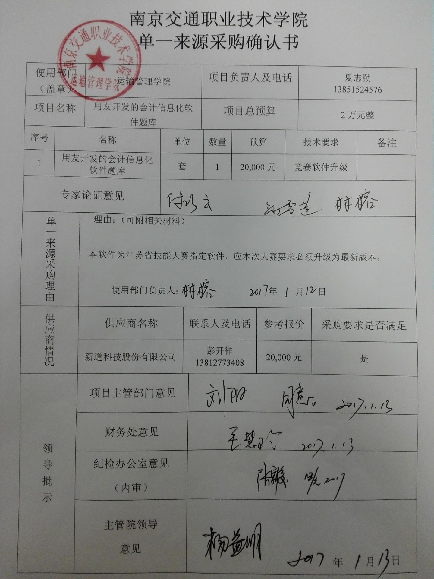 我部門受運輸管理學院的委托,擬對該部門委托的采購編號為JY2017008號會計技能大賽信息化題庫項目實施院級集中采購。本部門根據(jù)采購人的實際申報情況,擬對該項目采用單一來源采購方式。