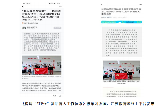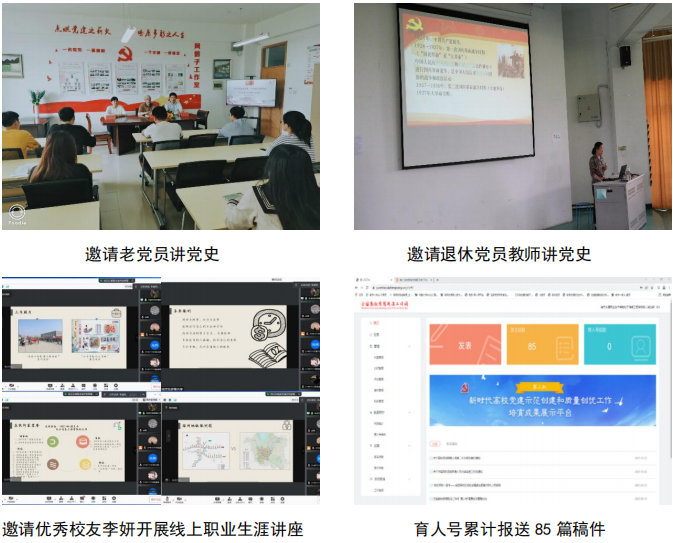 黨支部邀請南京交通職業(yè)技術(shù)學(xué)院關(guān)工委 80 余歲老黨員羅家琚同志和老黨員趙家華同志開展黨史專題報(bào)告。邀請 2017 級優(yōu)秀校友李妍開展“我的大學(xué)我的職業(yè)生涯路”線上講座。通過青春信息微信公眾號共推送 185 期宣傳文章,通過南京交通職業(yè)技術(shù)學(xué)院網(wǎng)站共計(jì)發(fā)布25 篇黨建宣傳報(bào)道,工作案例《構(gòu)建“紅色+”資助育人工作體系》被學(xué)習(xí)強(qiáng)國、江蘇教育、江蘇黨史主題教育等線上平臺發(fā)布。工作案例《筑牢基層黨建“三陣地” 力促育人工作“兩融合”》成功入選江蘇高校黨建工作典型案例 100 例。