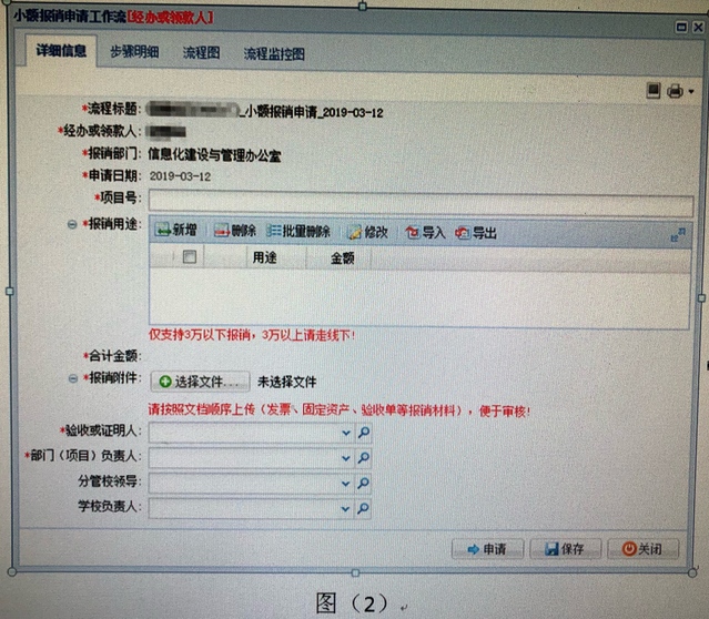 打星號(hào)的項(xiàng)目為必填項(xiàng)。3. 小額報(bào)銷簽批流程如圖(3)所示。