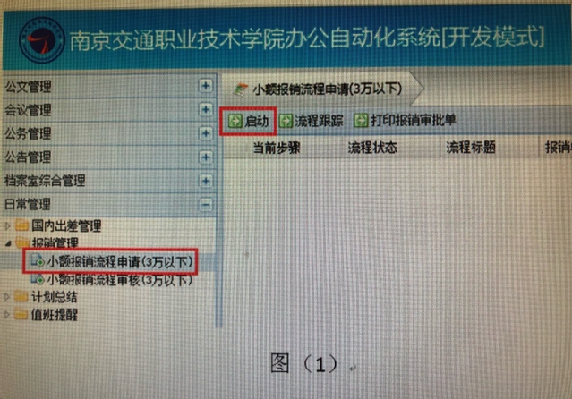 1.進(jìn)入辦公系統(tǒng)à日常管理à報(bào)銷管理à小額報(bào)銷流程申請(qǐng)(3萬(wàn)元及以下)如圖(1)所示:點(diǎn)擊啟動(dòng)。