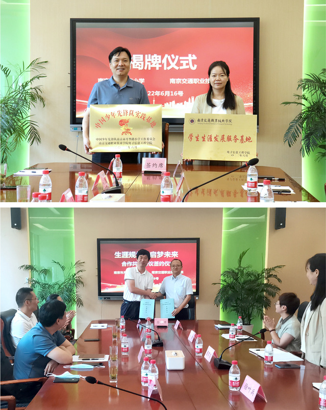 為充分發(fā)揮職業(yè)院?;鶎狱h組織在中小學(xué)職業(yè)啟蒙教育中的積極作用,幫助小學(xué)生理解職業(yè),提高職業(yè)能力培養(yǎng)意識(shí),近日,全國(guó)黨建工作樣板支部、南京交通職業(yè)技術(shù)學(xué)院電子信息工程學(xué)院第二黨支部攜手月華路小學(xué)黨支部結(jié)對(duì)共建職業(yè)生涯發(fā)展服務(wù)基地、紅領(lǐng)巾校外實(shí)踐基地。南京交通職業(yè)技術(shù)學(xué)院副院長(zhǎng)王道峰、招就處處長(zhǎng)耿巍、電子信息工程學(xué)院黨總支、第二黨支部及關(guān)工委相關(guān)負(fù)責(zé)人,月華路小學(xué)黨支部書記、校長(zhǎng)夏翠蓮、副校長(zhǎng)徐葉兵、學(xué)生活動(dòng)部及課程開發(fā)部負(fù)責(zé)人出席了簽約授牌儀式。