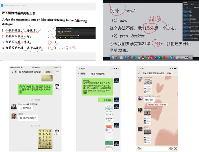 對外漢語教師選用釘釘教學平臺進行直播授課,為2019級留學生建立了“班級直播間”,老師們還通過釘釘群及班級微信群等多種渠道豐富學習形式,有序開展教學、輔導、督導、作業(yè)布置及測試等教學工作。汽車工程學院、路橋與港航工程學院、運輸管理學院、電子信息工程學院、建筑工程學院等開設的專業(yè)課以及計算機等公共課程采用直播、中國大學MOOC平臺、藍墨云與微信群相結合的授課模式,書法、體育等課程教師通過錄制視頻、上傳PPT到微信群,以學生觀看視頻提交作業(yè)的方式完成教學。