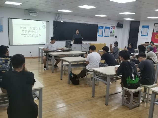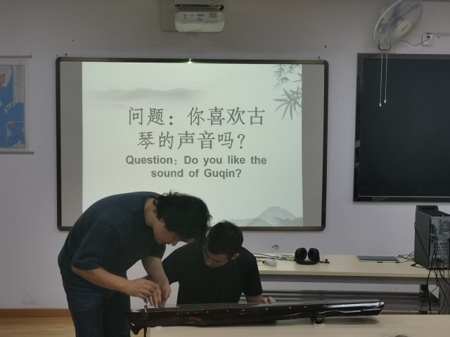 孫成東老師以歷史典故為引,向留學生全面而細致的介紹了古琴的制作工藝與悠久歷史,分享了它在中國的發(fā)展與傳承現(xiàn)狀,及其在中國哲學、美學上的地位和影響。國合辦老師進行翻譯,有效促進了師生間溝通交流。建筑工程學院中國學生演奏的一曲《天行九歌》,曲調(diào)婉轉(zhuǎn)悠揚、意味深長,孫成東老師彈奏的《酒狂》更是令同學們?nèi)绨V如醉、思緒徜徉。當晚的互動活動中,留學生們踴躍提問,對古琴藝術(shù)展現(xiàn)出濃厚興趣。在老師們的鼓勵和指導下,留學生們紛紛嘗試撥響古琴,在美妙的旋律中感受非遺文化的魅力。