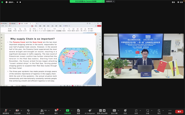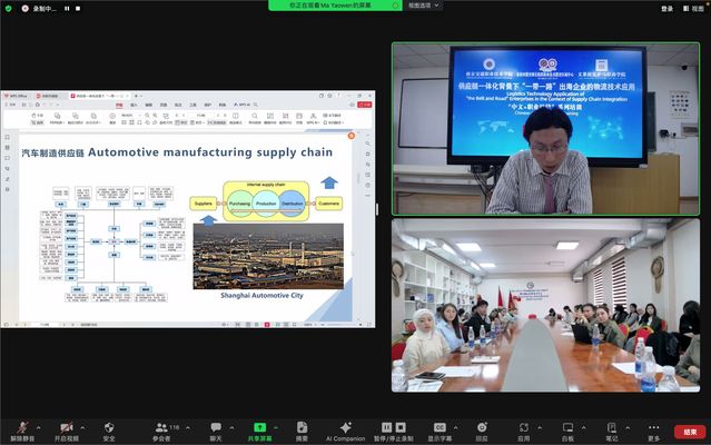 運輸管理學院馬耀文老師系統(tǒng)介紹了“一帶一路”背景下供應鏈一體化創(chuàng)新、冷鏈物流技術在中國出海企業(yè)的應用以及產教融合對中國企業(yè)物流技術應用的推動。相關專業(yè)知識還有針對性地設計了線上技能訓練和互動。培訓內容專業(yè)性高、實用性強,學生們反響熱烈。在互動答疑環(huán)節(jié),馬老師還就“推動新質生產力發(fā)展,與一帶一路國家生產企業(yè)共同創(chuàng)新打造一體化供應鏈”與學生們開展了深刻的交流探討,學生們踴躍提問,現(xiàn)場氣氛活躍。