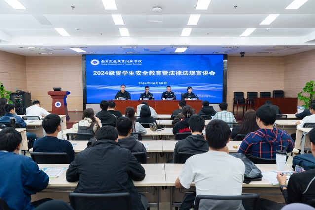 In order to enhance the legal awareness of international students, improve their safety precautionary ability, and ensure their safety and smoothness during their study in China, NJITT held a lecture on safety education and laws and regulations for international students of Class 2024 on October 28, which was hosted by the office of international cooperation and the security office, and the lecture was invited to be given by Zhu Jun, senior sergeant of grade 4 of the Exit-Entry Administration Brigade of the Public Security Bureau of Nanjing and Wang Chenxing, a police officer of the Exit-Entry Administration Brigade of the Jiangning Sub-bureau. The Party branch of the office of national cooperation, the director of the Security Office, the class teachers of international students and all international students of Class 2024 attended the event. The lecture was hosted by Wang Daibi, deputy secretary of the Party general branch of the foundation department.