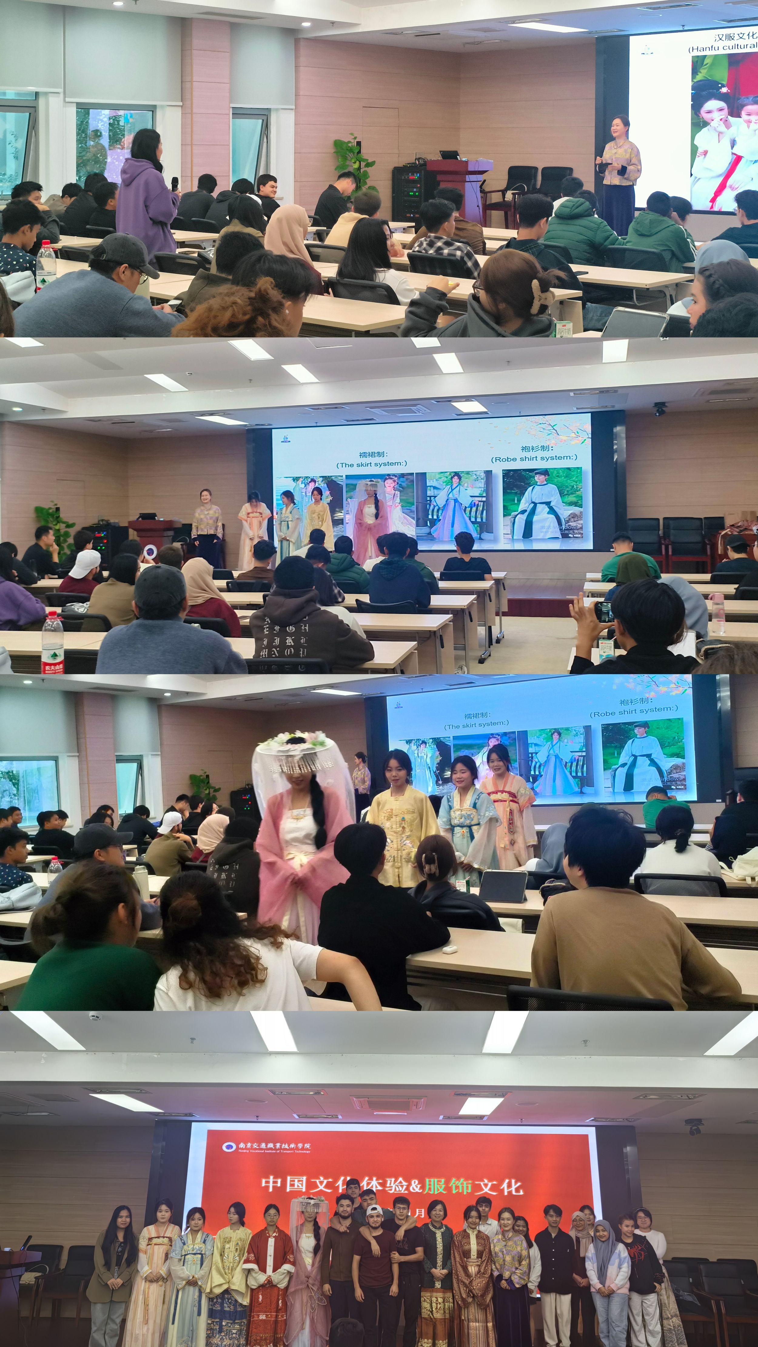 傳統(tǒng)服飾是中華民族悠久歷史文化的重要載體。為增進(jìn)留學(xué)生對(duì)中國(guó)傳統(tǒng)服飾文化的了解,11月11日,國(guó)合辦舉辦了精彩絕倫的留學(xué)生中國(guó)服飾文化講座及體驗(yàn)活動(dòng)。學(xué)校2023級(jí)、2024級(jí)全體留學(xué)生參加了本次活動(dòng),團(tuán)委國(guó)學(xué)社部分同學(xué)參加了活動(dòng)。講座和體驗(yàn)活動(dòng)由秦淮開放大學(xué)何鐵雨教授、基礎(chǔ)教學(xué)部(國(guó)際合作與交流辦公室)主任郭榮梅聯(lián)袂開展。