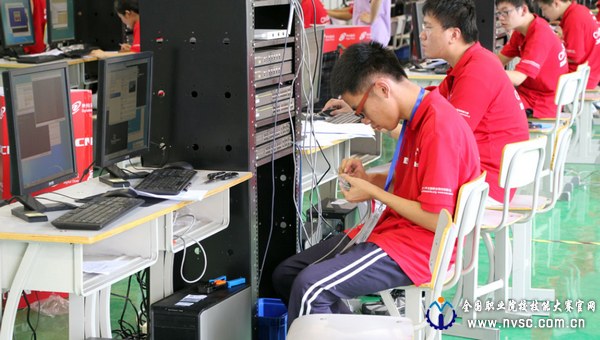 6月26日,網(wǎng)絡(luò)搭建及應(yīng)用比賽選手認(rèn)真連接線路