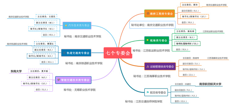 每個專委會設(shè)主任委員1人、秘書長1人,副主任委員、副秘書長及委員人數(shù)根據(jù)所指導(dǎo)專業(yè)的范圍確定。選聘了南京交通職業(yè)技術(shù)學(xué)院、江蘇航運(yùn)職業(yè)技術(shù)學(xué)院、南京鐵道職業(yè)技術(shù)學(xué)院、江蘇海事職業(yè)技術(shù)學(xué)院、東南大學(xué)、南京航空航天大學(xué)的7位兼具學(xué)術(shù)造詣和行業(yè)認(rèn)可度的專家擔(dān)任專委會主任委員。