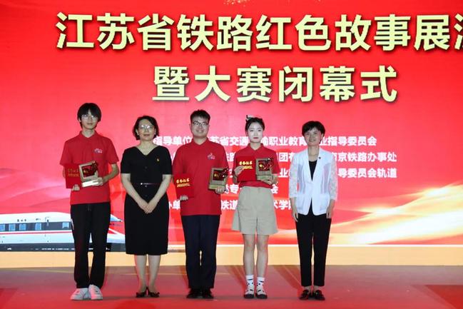 江蘇省交通運(yùn)輸廳副廳長(zhǎng)陳萍,江蘇省鐵路集團(tuán)有限公司黨委委員、機(jī)關(guān)黨委書記王勤為學(xué)生組一等獎(jiǎng)獲獎(jiǎng)學(xué)生頒獎(jiǎng)。