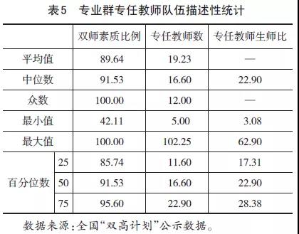運(yùn)用描述性統(tǒng)計(jì)對(duì)專(zhuān)業(yè)群專(zhuān)任教師隊(duì)伍進(jìn)行分析。從數(shù)據(jù)來(lái)看,高水平專(zhuān)業(yè)群的專(zhuān)任教師雙師素質(zhì)比例都較高,有32個(gè)專(zhuān)業(yè)群其專(zhuān)任教師雙師素質(zhì)比例為100%,中位數(shù)為91.53%,253個(gè)專(zhuān)業(yè)群的雙師素質(zhì)比例平均為89.64%。專(zhuān)任教師雙師素質(zhì)比例70%以下的專(zhuān)業(yè)群有7個(gè),最小的僅為42.11%。從專(zhuān)任教師數(shù)來(lái)看,每個(gè)專(zhuān)業(yè)擁有專(zhuān)任教師數(shù)19.23人,專(zhuān)任教師最少的專(zhuān)業(yè)僅5人,最多的有102人,中位數(shù)16.6人。從專(zhuān)任教師生師比來(lái)看,最小的專(zhuān)業(yè)可以達(dá)到3.08,而專(zhuān)任教師生師比最大的為62.90,差距比較大(表5)。