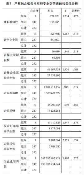 運(yùn)用單因素ANOVA檢驗(yàn)等對(duì)產(chǎn)教融合相關(guān)指標(biāo)和專(zhuān)業(yè)群建設(shè)等級(jí)進(jìn)行相關(guān)分析,發(fā)現(xiàn)大部分上述指標(biāo)與專(zhuān)業(yè)群建設(shè)等級(jí)不存在顯著性差異即p>0.05,相關(guān)性不明顯(表7)。