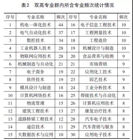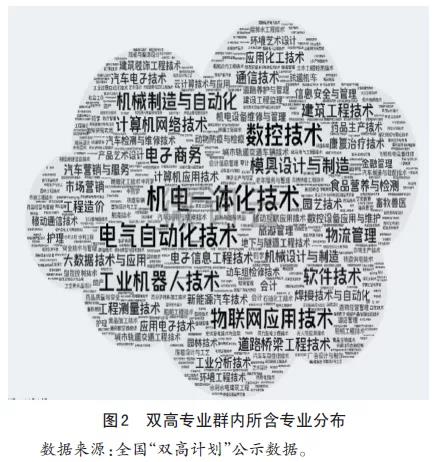 從專(zhuān)業(yè)群內(nèi)的專(zhuān)業(yè)結(jié)構(gòu)來(lái)看,253個(gè)專(zhuān)業(yè)群包括專(zhuān)業(yè)數(shù)1110個(gè),每個(gè)專(zhuān)業(yè)群平均包含專(zhuān)業(yè)數(shù)4.4個(gè)。其中,裝備制造大類(lèi)專(zhuān)業(yè)數(shù)283個(gè),占專(zhuān)業(yè)總數(shù)的25.5%;電子信息大類(lèi)專(zhuān)業(yè)數(shù)159個(gè),占專(zhuān)業(yè)總數(shù)的14.3%;財(cái)經(jīng)商貿(mào)大類(lèi)專(zhuān)業(yè)數(shù)106個(gè),占專(zhuān)業(yè)總數(shù)的9.5%;其次是交通運(yùn)輸大類(lèi)、土木建筑大類(lèi)、農(nóng)林牧漁大類(lèi)等。利用可視化分析技術(shù)和SPSS軟件的頻次統(tǒng)計(jì),結(jié)合雙高專(zhuān)業(yè)群內(nèi)所含專(zhuān)業(yè)頻次統(tǒng)計(jì)(表2)和專(zhuān)業(yè)分布云圖(圖2)分析,所含專(zhuān)業(yè)最多的是機(jī)電一體化、電氣自動(dòng)化技術(shù)、數(shù)控技術(shù)、工業(yè)機(jī)器人技術(shù)、物聯(lián)網(wǎng)應(yīng)用技術(shù)、機(jī)械制造與自動(dòng)化等制造類(lèi)專(zhuān)業(yè),電子商務(wù)、軟件技術(shù)、大數(shù)據(jù)技術(shù)與應(yīng)用、計(jì)算機(jī)網(wǎng)絡(luò)技術(shù)等專(zhuān)業(yè)也占據(jù)了不少比例。