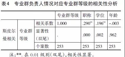 把雙高建設(shè)等級(jí)按校A類(lèi)、校B類(lèi)、校C類(lèi)、專(zhuān)業(yè)群A類(lèi)、專(zhuān)業(yè)群B類(lèi)、專(zhuān)業(yè)群C類(lèi)6個(gè)級(jí)別分別賦值1~6,專(zhuān)業(yè)群負(fù)責(zé)人的職稱(chēng),職稱(chēng)(二級(jí)教授、三級(jí)教授、教授、其他)、學(xué)位(博士、碩士、學(xué)位、其他)、年齡(40歲以下、41~50歲、51~60歲、60歲以上)按各大自分類(lèi)分別賦值1-4。從描述性統(tǒng)計(jì)分析結(jié)果來(lái)看,專(zhuān)業(yè)群負(fù)責(zé)人具有二級(jí)教授和三級(jí)教授在專(zhuān)業(yè)群等級(jí)數(shù)值上明顯低于其他職稱(chēng),具有博士學(xué)位的負(fù)責(zé)人在數(shù)值上也明顯低于具有學(xué)士學(xué)位和其他,而在年齡層面,負(fù)責(zé)人年齡在40歲以下的專(zhuān)業(yè)群等級(jí)數(shù)值相對(duì)較高。運(yùn)用斯皮爾曼相關(guān)系數(shù)進(jìn)一步進(jìn)行相關(guān)分析,從表4可以看出,專(zhuān)業(yè)群負(fù)責(zé)人的職稱(chēng)和學(xué)位與專(zhuān)業(yè)群建設(shè)等級(jí)的相關(guān)性在p=0.01級(jí)別上存在顯著相關(guān),而年齡并沒(méi)有體現(xiàn)出顯著的相關(guān)性。