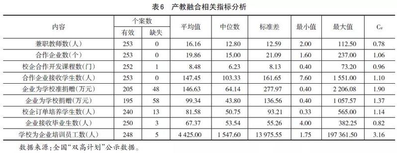 深化產(chǎn)教融合是高水平專(zhuān)業(yè)群建設(shè)推進(jìn)人才培養(yǎng)模式改革、提高教學(xué)質(zhì)量的重要途徑。與產(chǎn)教融合相關(guān)的指標(biāo)主要有兼職教師數(shù)、合作企業(yè)數(shù)、校企合作開(kāi)發(fā)課程情況、合作企業(yè)接收學(xué)生頂崗實(shí)習(xí)情況、訂單培養(yǎng)、學(xué)校為企業(yè)培訓(xùn)員工等內(nèi)容。對(duì)于一組數(shù)據(jù)的分析,不僅需要集中數(shù)量指標(biāo),而且還需要差異量數(shù)的指標(biāo),只有兩者結(jié)合起來(lái),才能對(duì)數(shù)據(jù)做較全面的分析,差異量越大,說(shuō)明集中量的代表性越差;差異量越小,說(shuō)明集中量的代表性越好。同時(shí),在分析中引入變異系數(shù)(Coefficientof Variation),簡(jiǎn)稱(chēng)CV,它是標(biāo)準(zhǔn)差與平均值的比值,計(jì)算公式: