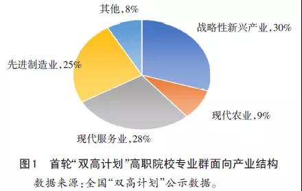 專(zhuān)業(yè)群建設(shè)是推進(jìn)“雙高計(jì)劃”建設(shè)和高職院校內(nèi)涵式發(fā)展的切入點(diǎn),是推進(jìn)區(qū)域經(jīng)濟(jì)發(fā)展的重要基礎(chǔ)。從對(duì)接產(chǎn)業(yè)結(jié)構(gòu)分析,有75個(gè)專(zhuān)業(yè)群面向戰(zhàn)略性新興產(chǎn)業(yè),有71個(gè)專(zhuān)業(yè)群面向現(xiàn)代服務(wù)業(yè),有63個(gè)專(zhuān)業(yè)群面向先進(jìn)制造業(yè),有23個(gè)專(zhuān)業(yè)群面向現(xiàn)代農(nóng)業(yè)。面向戰(zhàn)略性新興產(chǎn)業(yè)、先進(jìn)制造業(yè)和現(xiàn)代服務(wù)業(yè)的專(zhuān)業(yè)群占比達(dá)到83%,如圖1所示。