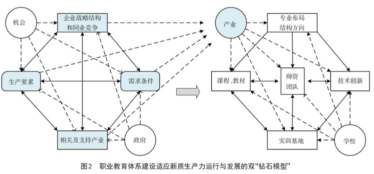 一是優(yōu)化高素質(zhì)技能人力培養(yǎng)專業(yè)布局,統(tǒng)籌高級別生產(chǎn)要素,布局人力資源數(shù)量、層次、結(jié)構(gòu),支撐產(chǎn)業(yè)戰(zhàn)略發(fā)展治理和部署。二是圍繞人才培養(yǎng)開發(fā)產(chǎn)教融合優(yōu)質(zhì)課程、新形態(tài)教材及配套資源等育人要素。三是根據(jù)產(chǎn)業(yè)發(fā)展需求開展技術(shù)應(yīng)用創(chuàng)新,服務(wù)行業(yè)企業(yè)生產(chǎn)效能提升,促進(jìn)企業(yè)技術(shù)進(jìn)步和技藝革新。四是建設(shè)支撐上下游企業(yè)發(fā)展的生產(chǎn)性實訓(xùn)基地,促進(jìn)校企、校校合作,共建共享資源,推動產(chǎn)業(yè)降本增效。五是打造高水平現(xiàn)代化師資團隊,素質(zhì)優(yōu)良、技藝精湛、數(shù)字技能過硬的教師既是育人要素又是技術(shù)創(chuàng)新的重要環(huán)節(jié),是實現(xiàn)所有關(guān)鍵環(huán)節(jié)的中樞,因此在鉆石模型中增加這一關(guān)鍵要素。這五個方面是現(xiàn)代職業(yè)教育體系核心競爭優(yōu)勢的關(guān)鍵要素,為新質(zhì)生產(chǎn)力提供重要服務(wù)和支撐。(圖2