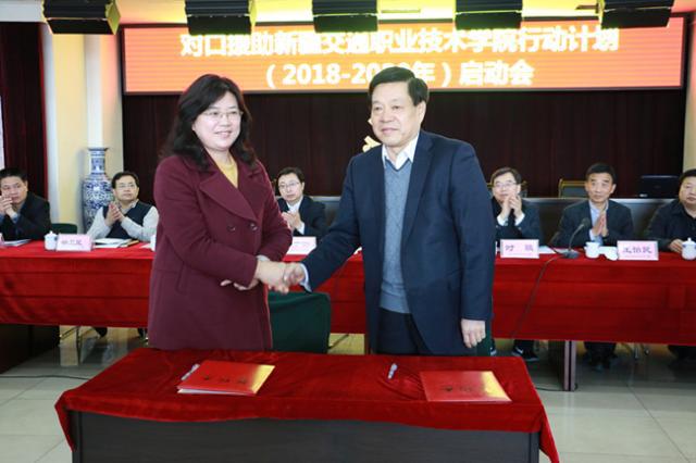 學院黨委書記賈俐俐出席會議,代表學院與新疆交通職業(yè)技術學院院長、黨委副書記段明社簽署了對口援助協(xié)議。會議期間,賈俐俐書記與自治區(qū)交通運輸廳黨委副書記、廳長祖麗菲婭?阿布都卡德爾,交通運輸部人事教育司副司長時駿,就進一步做好援疆工作和學校建設等方面作了交流。