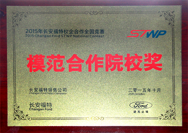 在“長(zhǎng)安福特校企合作全國(guó)競(jìng)賽”中,學(xué)院榮獲2015年長(zhǎng)安福特校企合作項(xiàng)目“模范合作院?!狈Q(chēng)號(hào),汽車(chē)工程學(xué)院文愛(ài)民獲“模范項(xiàng)目負(fù)責(zé)人”稱(chēng)號(hào),程麗群獲“模范教師”稱(chēng)號(hào),喬宗權(quán)獲“優(yōu)秀教師”稱(chēng)號(hào),李飛飛等8名學(xué)生獲“優(yōu)秀學(xué)生”稱(chēng)號(hào)。