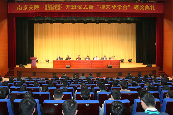 開班儀式,張毅院長分別和杜曙光先生、高燕女士為“賽特訂單班”、“建淳冠名班”揭牌。 “捷宏獎學(xué)金”頒獎典禮,周傳林副院長宣讀了獎勵決定,主席臺領(lǐng)導(dǎo)為獲獎同學(xué)頒發(fā)了獎勵證書。