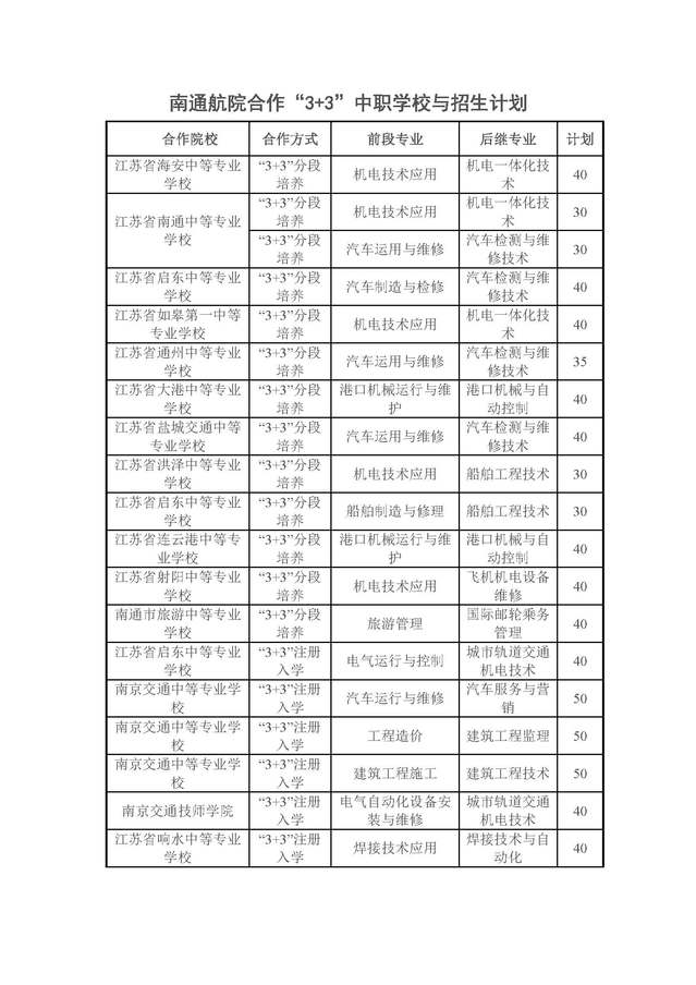 南通航運職業(yè)技術(shù)學院合作“3+3”中職學校與招生計劃