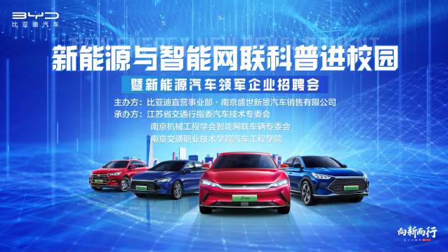 11月3日,由學(xué)校工會、汽車工程學(xué)院攜手比亞迪直營事業(yè)部及南京盛世新景汽車銷售有限公司等在南京交院圖書館廣場開展了“新能源與智能網(wǎng)聯(lián)科普進(jìn)校園暨新能源汽車領(lǐng)軍企業(yè)招聘會”。江蘇省交通行指委汽車技術(shù)類專委會秘書長、南京機(jī)械工程學(xué)會智能網(wǎng)聯(lián)車輛專委會3位委員、汽車工程學(xué)院全體院領(lǐng)導(dǎo),比亞迪直營事業(yè)部第三戰(zhàn)區(qū)謝國慶副總監(jiān)和南京8家直營店店長參加了此次活動。