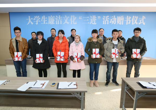 為進一步培養(yǎng)大學生崇廉尚潔的思想觀念,12月12日下午,學院紀委在弘毅樓223會議室舉行了大學生廉政文化“三進”活動贈書儀式,以此在學院掀起讀書廉政教育活動,促進學生接受廉政文化熏陶,培養(yǎng)學生尊敬廉潔人物、推崇廉潔行為的情感,增強學生遵紀守法的意識,提高反腐倡廉的自覺性。