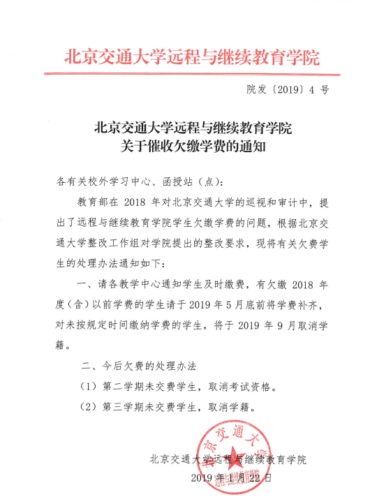 轉(zhuǎn)發(fā)北交大催繳學(xué)費(fèi)的通知