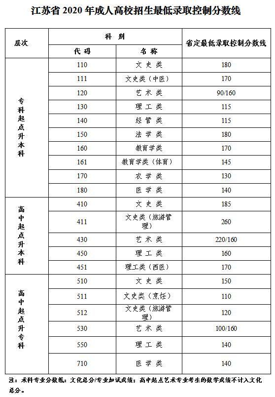 江蘇省2020年成人高校招生最低錄取控制分?jǐn)?shù)線(xiàn)是根據(jù)成人高等教育對(duì)新生的基本要求,參照考生統(tǒng)考科目成績(jī)和我省的招生計(jì)劃,按學(xué)歷層次和科類(lèi)分別劃定,經(jīng)省教育廳批準(zhǔn),現(xiàn)向社會(huì)發(fā)布。(詳見(jiàn)附件)。