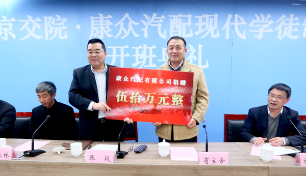 開(kāi)班典禮上,康眾學(xué)院院長(zhǎng)、江蘇康眾汽配有限公司售后總監(jiān)王潤(rùn)良、運(yùn)輸管理學(xué)院院長(zhǎng)呂亞君分別介紹了“康眾學(xué)徒制班”基本情況及人才培養(yǎng)方案;學(xué)生代表?xiàng)顐プ隽私涣靼l(fā)言。會(huì)上,學(xué)院、企業(yè)及學(xué)生代表簽訂了《“康眾學(xué)徒制班”三方協(xié)議》,校企雙方舉行了2017年合作辦學(xué)經(jīng)費(fèi)捐贈(zèng)儀式。