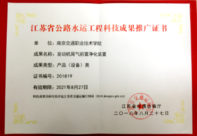 近日,江蘇省交通運(yùn)輸廳發(fā)布《2018年度江蘇省公路水運(yùn)工程科技成果推廣目錄》,列入本次《目錄》的公路水運(yùn)工程科技成果全省共計(jì)30項(xiàng)。學(xué)院節(jié)能減排中心科研團(tuán)隊(duì)研發(fā)的一項(xiàng)新產(chǎn)品《發(fā)動(dòng)機(jī)尾氣前置凈化裝置》位列其中。